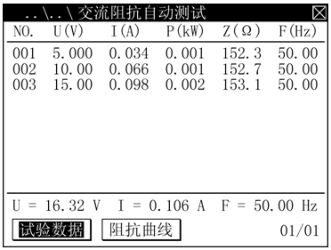 在交流阻抗手動測試界面下,慢速調節調壓器開始升壓,當出現試驗需要的電壓或電流值時,選擇 記錄數據 功能按鈕按<確認>鍵,儀器將自動記錄、顯示一組在當前測試點下的各參數的測試數據;以此類推……直到zui大輸出電壓或電流設定值,儀器蜂鳴器發出提示音,提示測試完畢,此時應迅速將調壓器歸零。